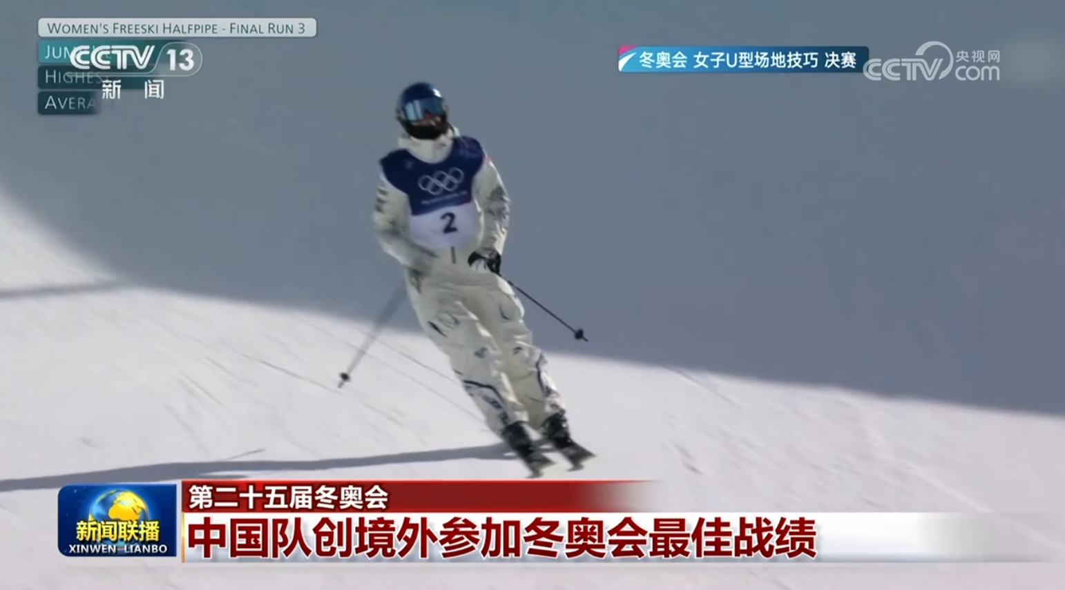 央视网消息(新闻联播):在米兰冬奥会自由式滑雪女子U型场地技巧决赛中,中国选手谷爱凌凭借94.75分的成绩为中国队再添一枚金牌,另一位中国选手李方慧收获银牌。在前一个比赛日中,由徐梦桃、王心迪、李天马组成的中国队获得自由式滑雪空中技巧混合团体比赛铜牌。截至目前,中国体育代表团已获得5金4银6铜共15枚奖牌,创下境外参加冬奥会的最佳战绩。