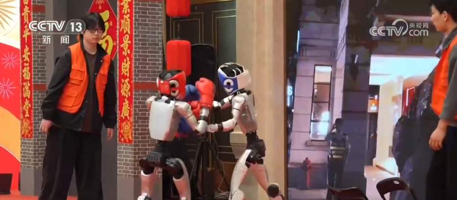 在上海市普陀区环球港,许多市民被春晚同款机器人的精彩表演吸引。两台机器人拳击手相对而立。指令下达后,它们迅速进入状态,互相比拼,引来围观市民阵阵喝彩。