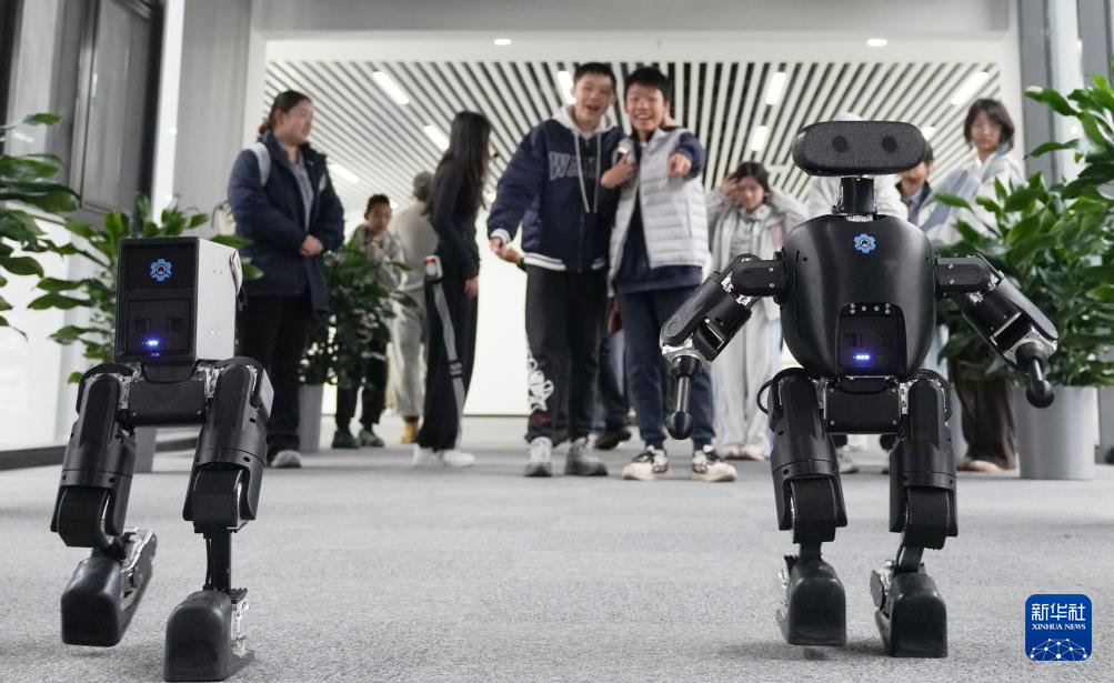 4月9日,学生在石景山人形机器人数据训练中心参观。新华社记者李欣摄