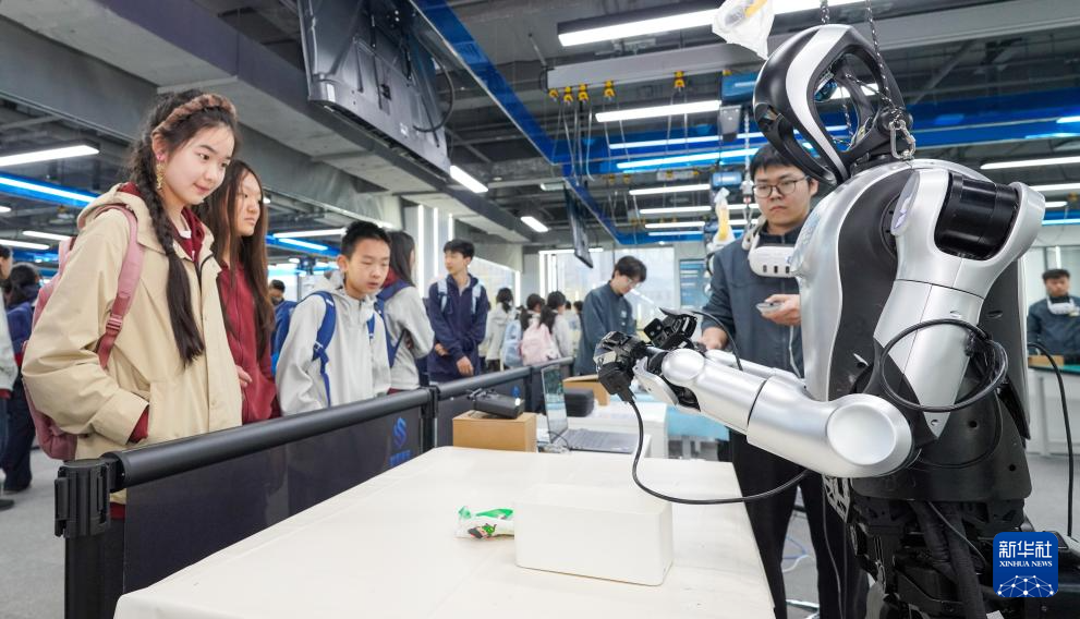 4月9日,学生在石景山人形机器人数据训练中心参观。新华社发(靳晶 摄)