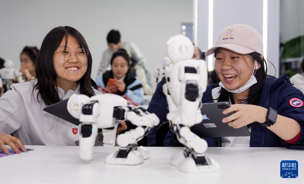 4月9日,学生在石景山人形机器人数据训练中心操控小型机器人。新华社发(靳晶 摄)