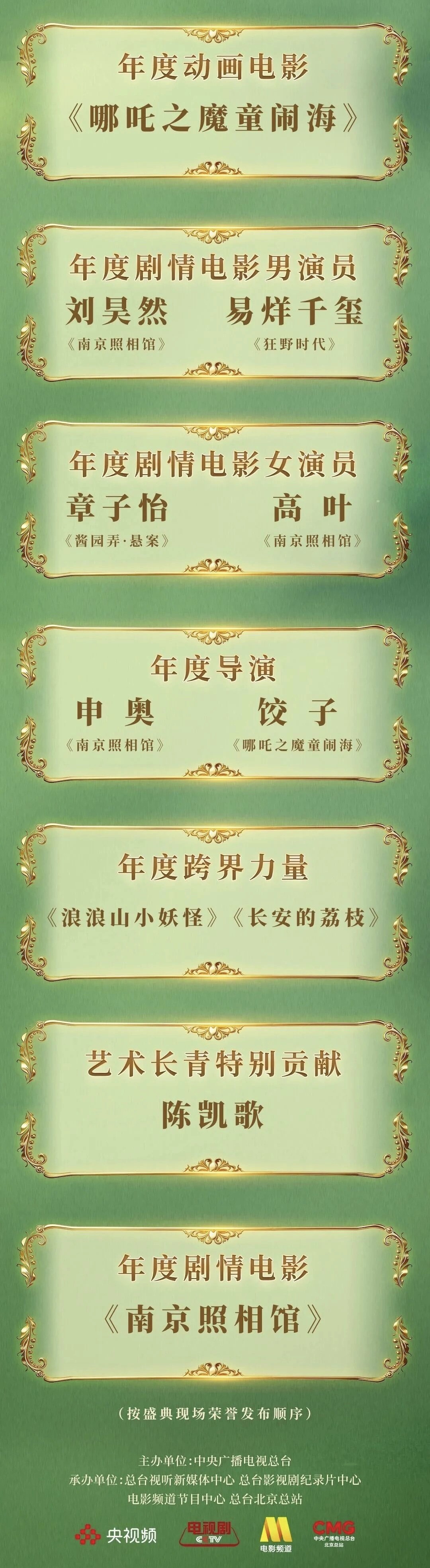 《南京照相馆》斩获年度剧情电影、年度导演、年度编剧、年度剧情电影男演员、年度剧情电影女演员共五项荣誉。导演申奥在发表感言时特别感谢,在总台领导的建议下,将电影名从《吉祥照相馆》改为《南京照相馆》,“南京”两个字有着厚重的历史感、家国情,督促着我们创作出更具有广度和深度的作品。
