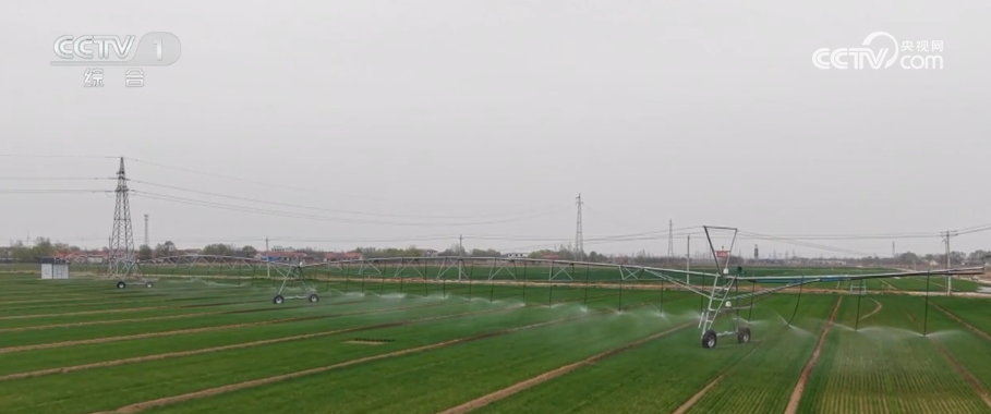 在山东德州庆云县尚堂镇的一处千亩高标准农田,青绿色的麦苗长势喜人。田间,一台指针式喷灌机正在工作,长达数百米的灌溉臂匀速喷出细密水雾滋润着每一株麦苗。