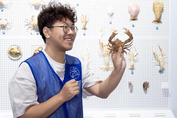 这份童年的迷恋,让他在进入浙江海洋大学后,毫不犹豫地选择了海洋生物方向。大一时,他加入学校海洋生物协会解说部,从此与海洋生物博物馆结下不解之缘。也是在这里,他第一次见到那只甘氏巨螯蟹标本——体型庞大,姿态威严,仿佛带着深海的神秘与力量。