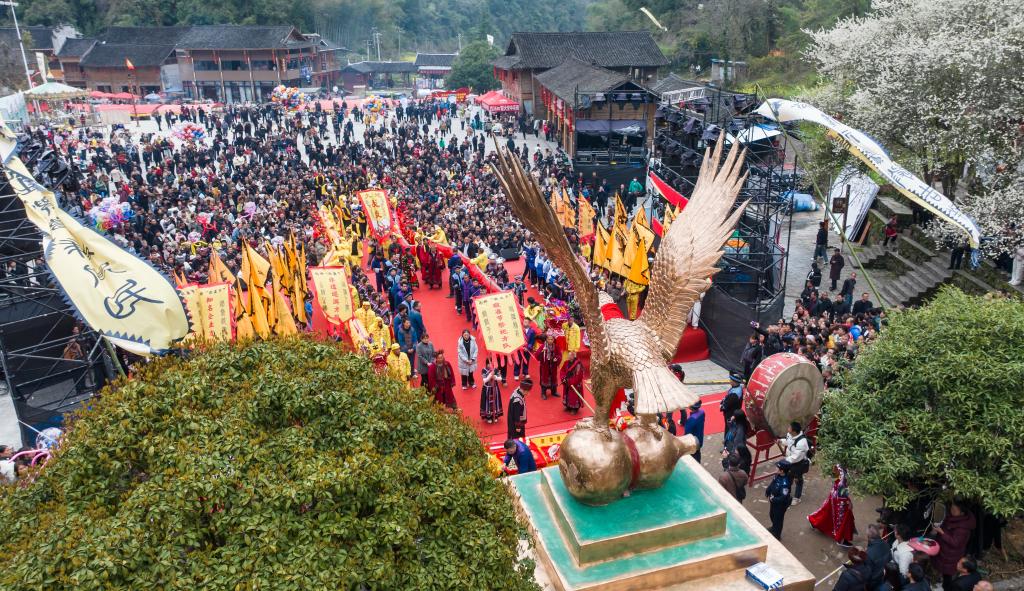 仡佬敬雀节活动现场(无人机照片)。新华社发