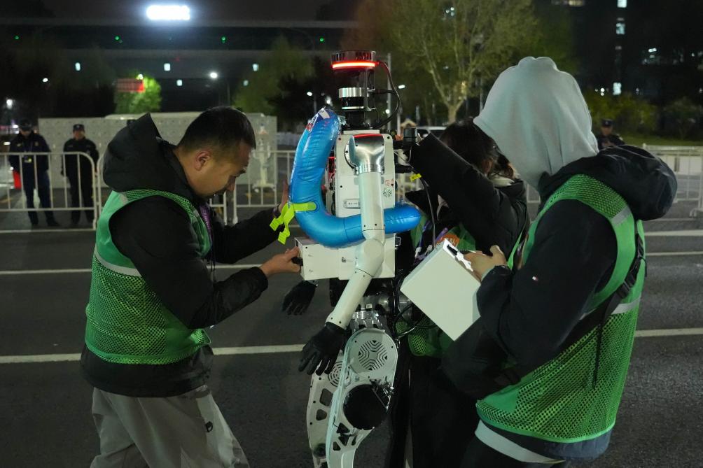 2025年4月19日,参加人形机器人半程马拉松的天工队选手在抵达终点后。新华社记者 李贺 摄